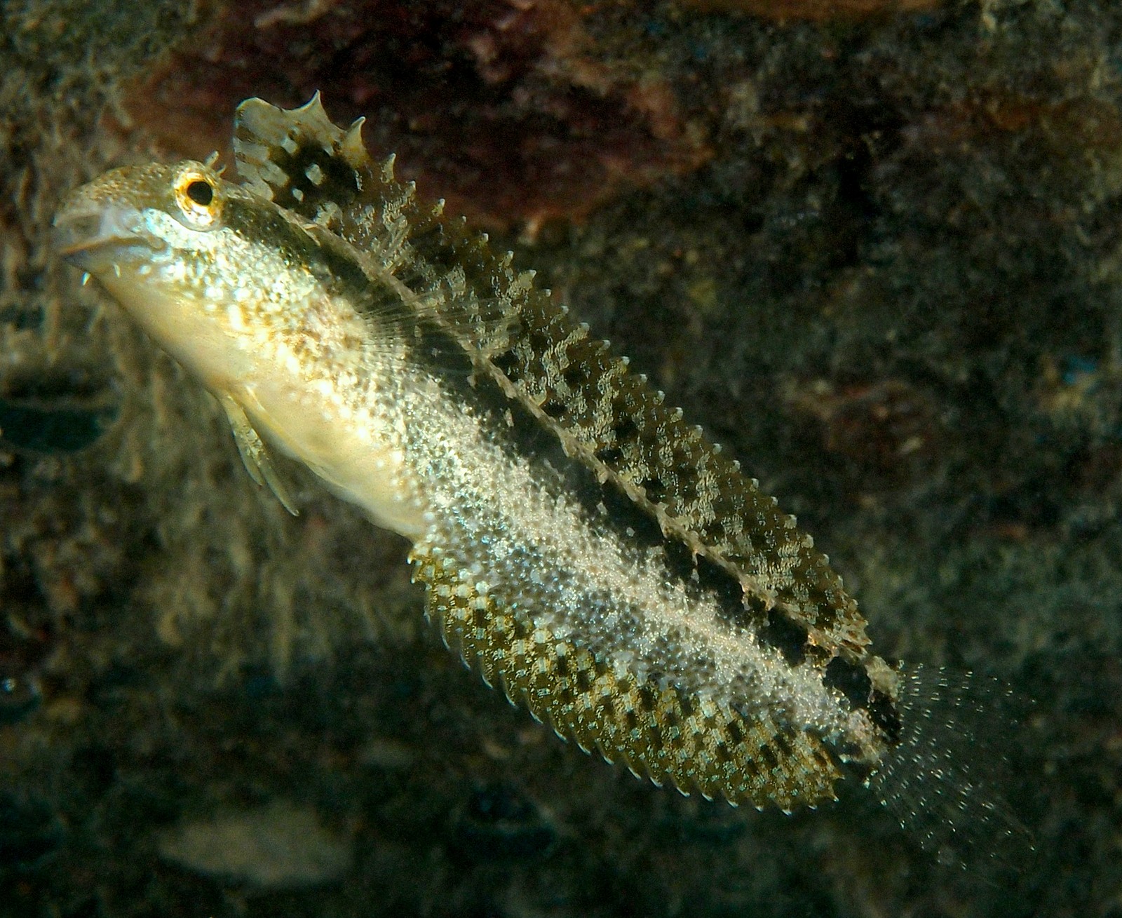 Dorsal spines (total): 11; Dorsal soft rays (total): 19-20; Anal spines: 2; Anal soft rays: 18-20 (rarely: 18); Pectoral soft rays typically: 14; Segmented caudal rays: 1, unbranched. Jaw teeth incisiform, rigid, close-set, increasing with age; Large, curved canine tooth on each side at posterior of lower jaw, and smaller canine on each side at posterior of upper jaw (similar dentition shared within genera); Lower end of gill opening above level of pectoral fin base (also a shared character within genera); Small unbranched cirrus on each side of chin; With or without small supraorbital and nuchal cirri; Body depth at anal-fin origin: 4.5-7.0 SL; Males with elongated second dorsal spine; Unnotched dorsal fin; Caudal fin interradial membranes slightly incised, notably in males. Max. length: 13.0 cm TL. Depth range: 1 - 25 m, usually: 1 - 10 m.