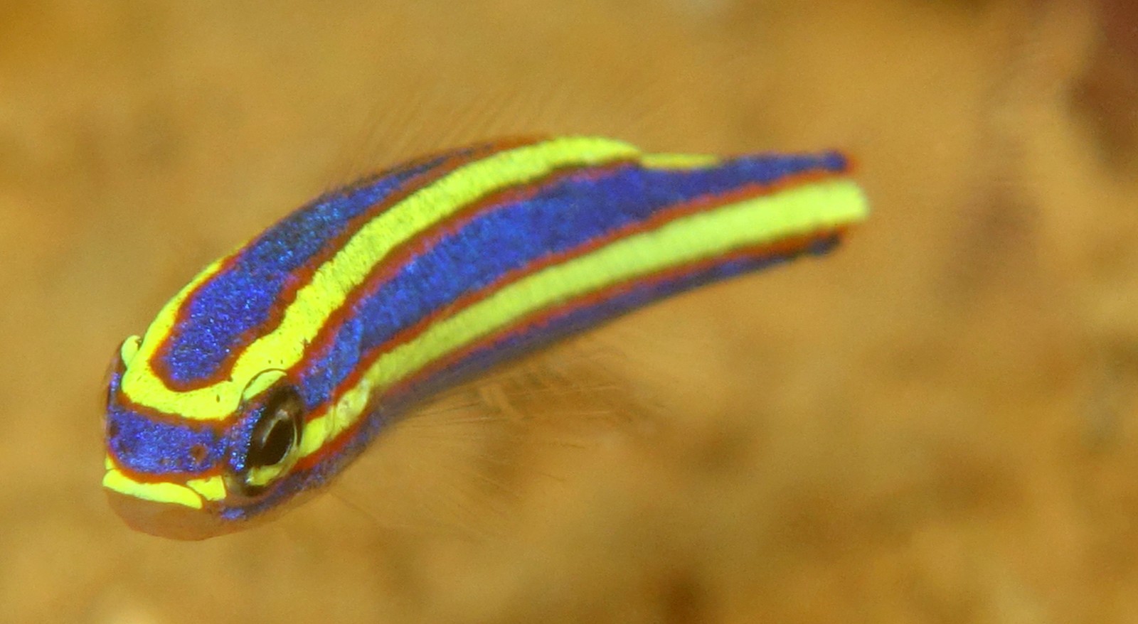 - 4.0 cm TL juveniles had a deep purplish blue head and body with two brown-edged bright yellow stripes, the uppermost of the latter extending on each side from the upper part of the caudal peduncle over the eye to above the anterior eye margin, thereafter joining in the dorsal midline on the head. The width of the stripe was narrower than the pupil diameter, that part of the stripe above the eye being the narrowest. The lower bright yellow stripe ran from the tip of the upper lip to the anteroventral margin of the eye, and from the posteroventral margin of the eye through above the pectoral fin base to the middle of the posterior margin of the caudal-fin base. The posterior part (posterior to eye) of the lower strip was wider than both the anterior part (anterior to eye) and the upper stripe. The widest part of the lower stripe, between the pectoral and anal-fin bases, was subequal to the pupil diameter. The eye, except for the black pupil, was usually bright yellow. All fins were transparent.
