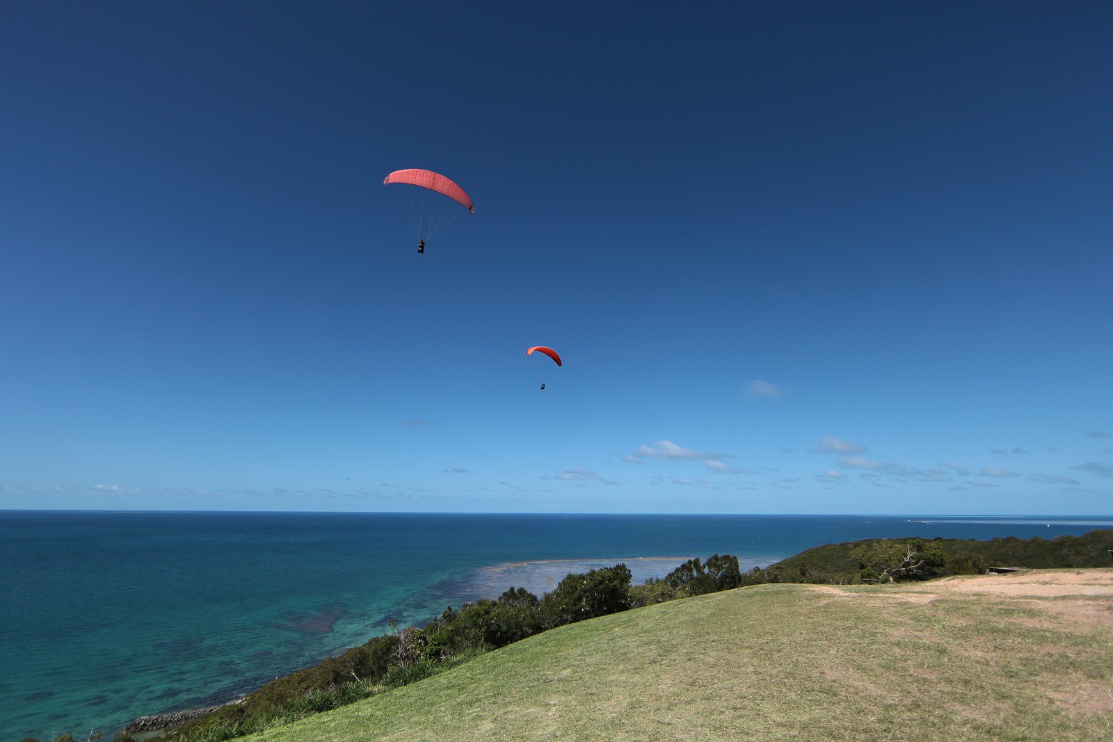 Paragliding is the recreational and competitive adventure sport of flying paragliders: lightweight, free-flying, foot-launched glider aircraft with no rigid primary structure. The pilot sits in a harness suspended below a hollow fabric wing whose shape is formed by its suspension lines, the pressure of air entering vents in the front of the wing and the aerodynamic forces of the air flowing over the outside.