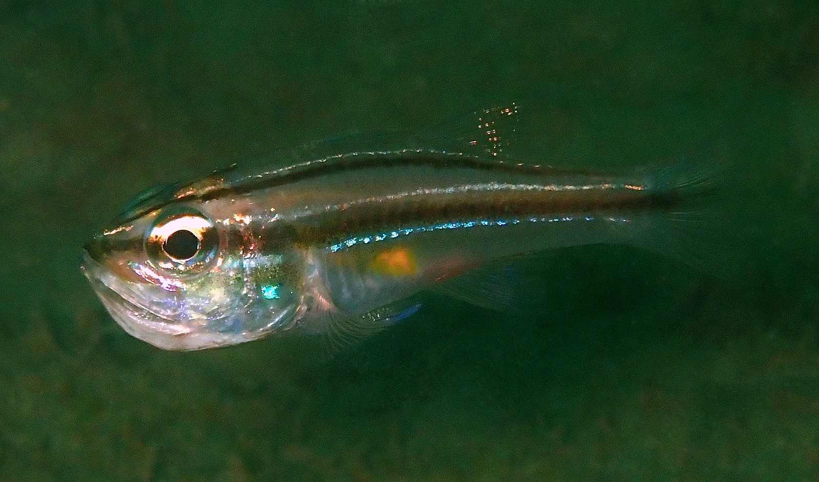 Mid-lateral black line broad from tip of snout to end of caudal fin, bordered by white lines. A thin black stripe from top of snout over eye, running along upper sides to about midway of caudal peduncle. Paralleled by a white line closely above to end of second dorsal fin base. A small pale blue psot low on gill-cover below white line.