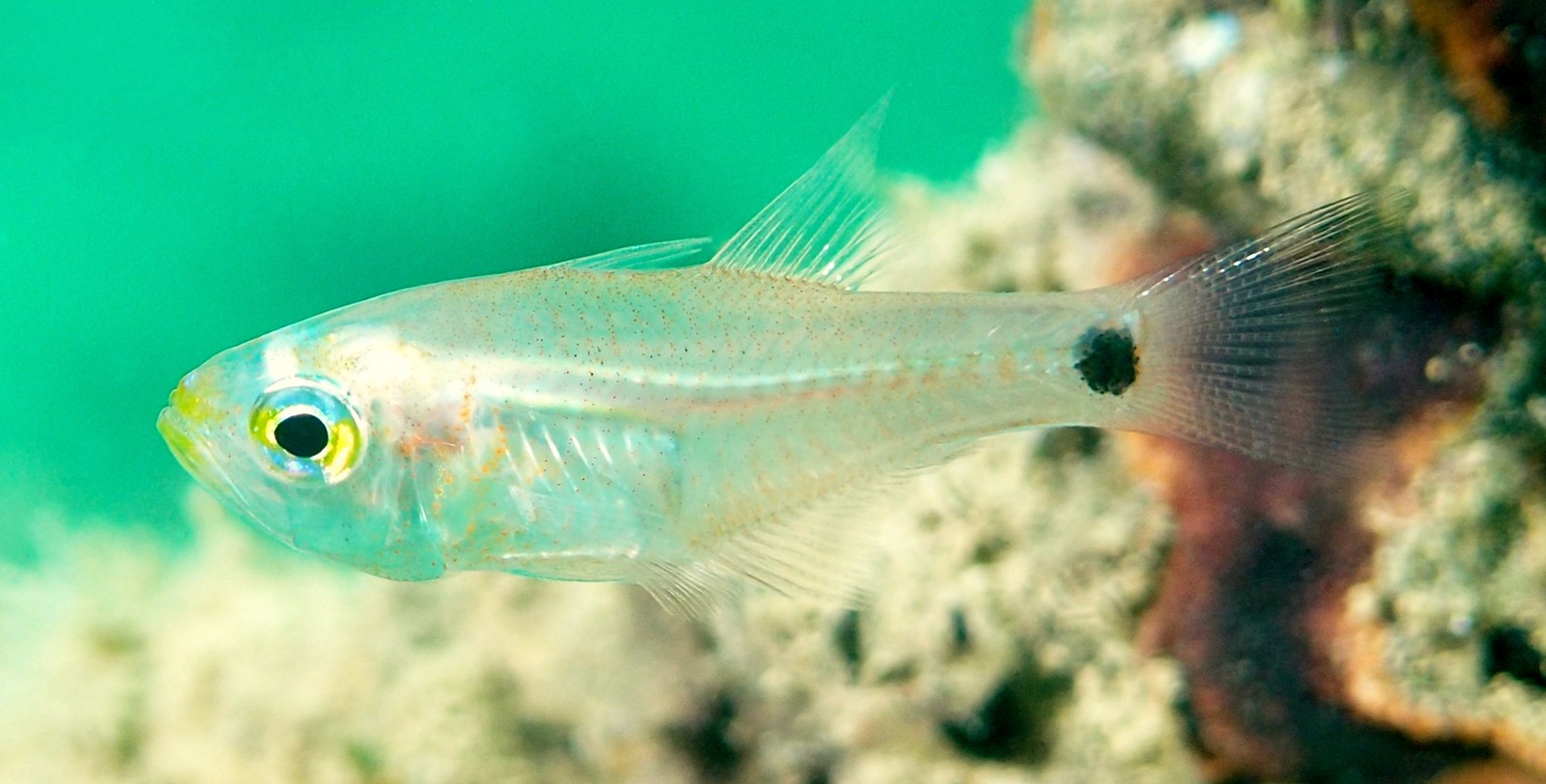 Taeniamia fucata Apogon à stries oranges juvénile Nouvelle-Calédonie tache ronde et noire peu marquée à la base de la nageoire caudale