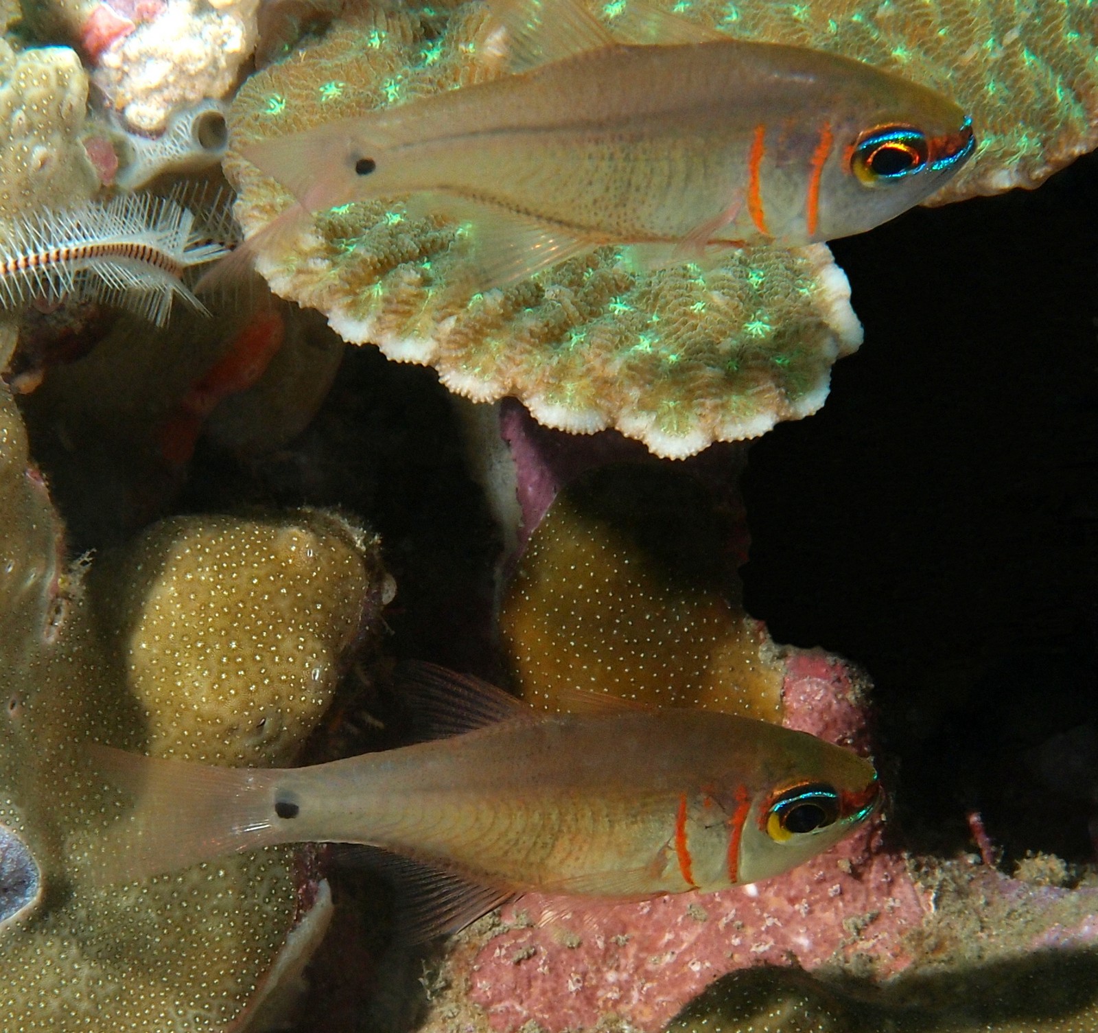 Present in sheltered bays and lagoons. Nocturnal species which lives the day hidden in the branching corals. At night this apogon forms schools and approaches the surface of these corals. Feeds at night on small invertebrates, mainly crustaceans. There is no sexual dimorphism and the sexes are separated. The couples are formed only in period of reproduction. At the end of a courtship the female lays her eggs which are immediately fertilized by the male. These eggs are sticky and aggregate into a ball, which the male immediately swallows. They are then incubated inside his mouth until the moment of the hatching. During all this period, the male cannot feed. The larvae have a planktonic life of a few weeks.