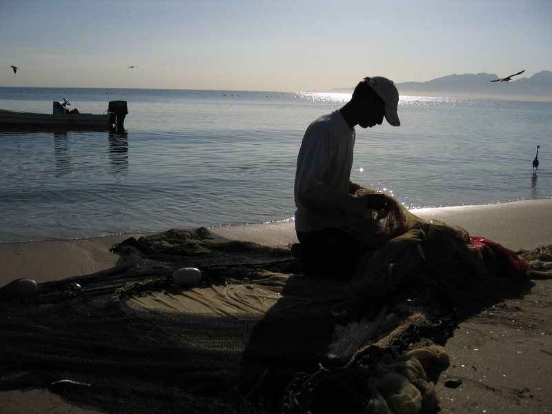 PECHEUR SUR LA PLAGE TRIANT SON FILET