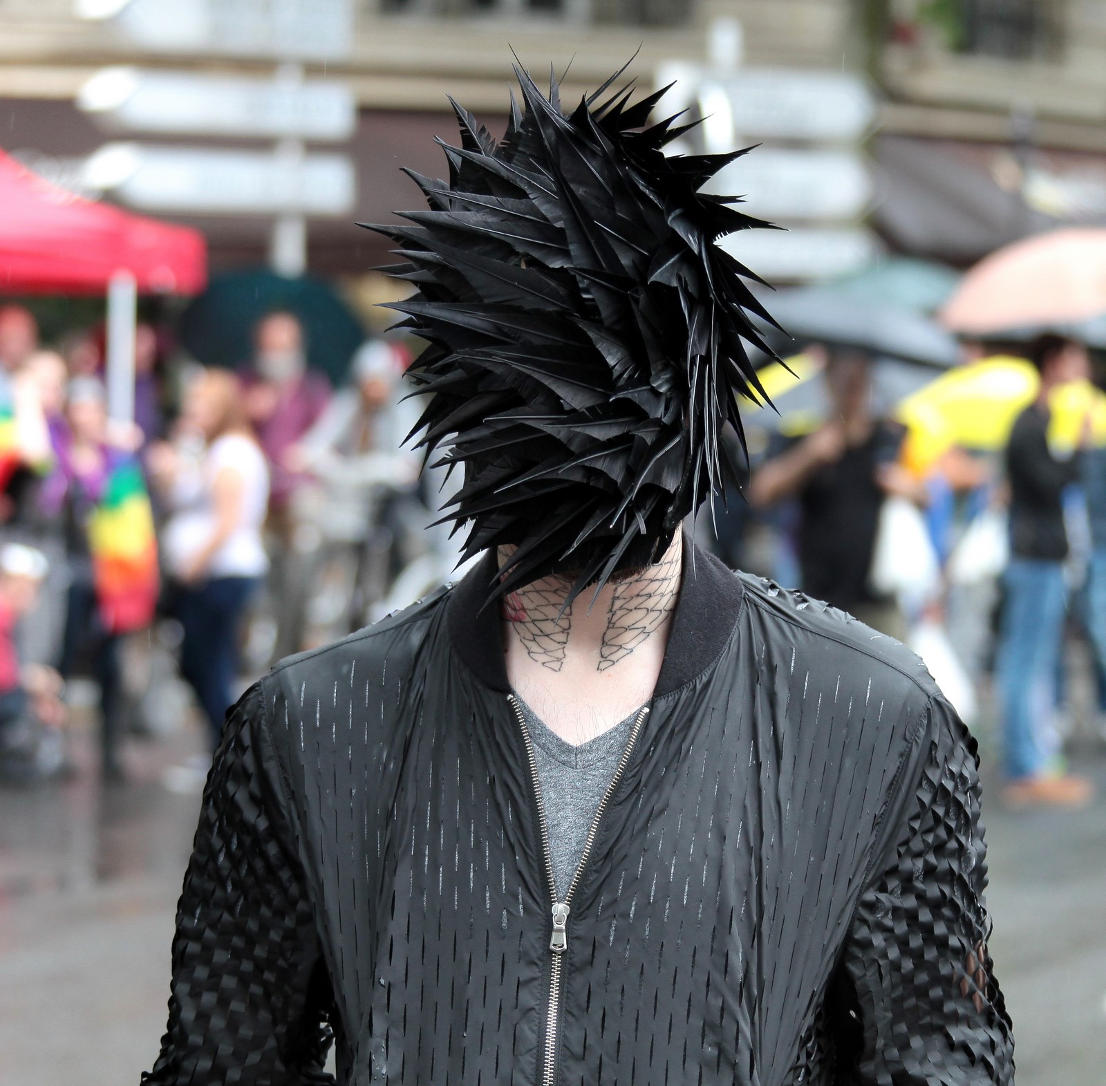 Homme masque en plumes noires Gay Pride Paris 2014 fiertés lesbiennes gaies bi trans homophobie homosexuel